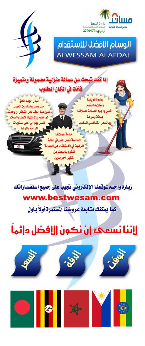 المكتب مرخص من قبل وزارة العمل يقدم خدماته في استقدام عمالة منزلية ومهنية من الجنسيات المصرح بها من الوزارة مثل الهند والفلبين. إساد شركة مساهمة مغلقة بدأت منذ عام 2013م و كانت من أولى الشركات المصرح لهم من وزارة العمل والتنمية الاجتماعية في قطاع الاستقدام و إدارة الموارد البشرية في المملكة العربية السعودية خلال هذه المدة ساهمت إساد بتقديم. يوجد استقدام الفلبين بنجلادش ب افضل الاسعار الهند جميع العماله الرجاليه سرعه في الاستقدام. 20 دقيقة فقط تكفيك للتعاقد مع عاملة مميزة لك عملاء تمكين.