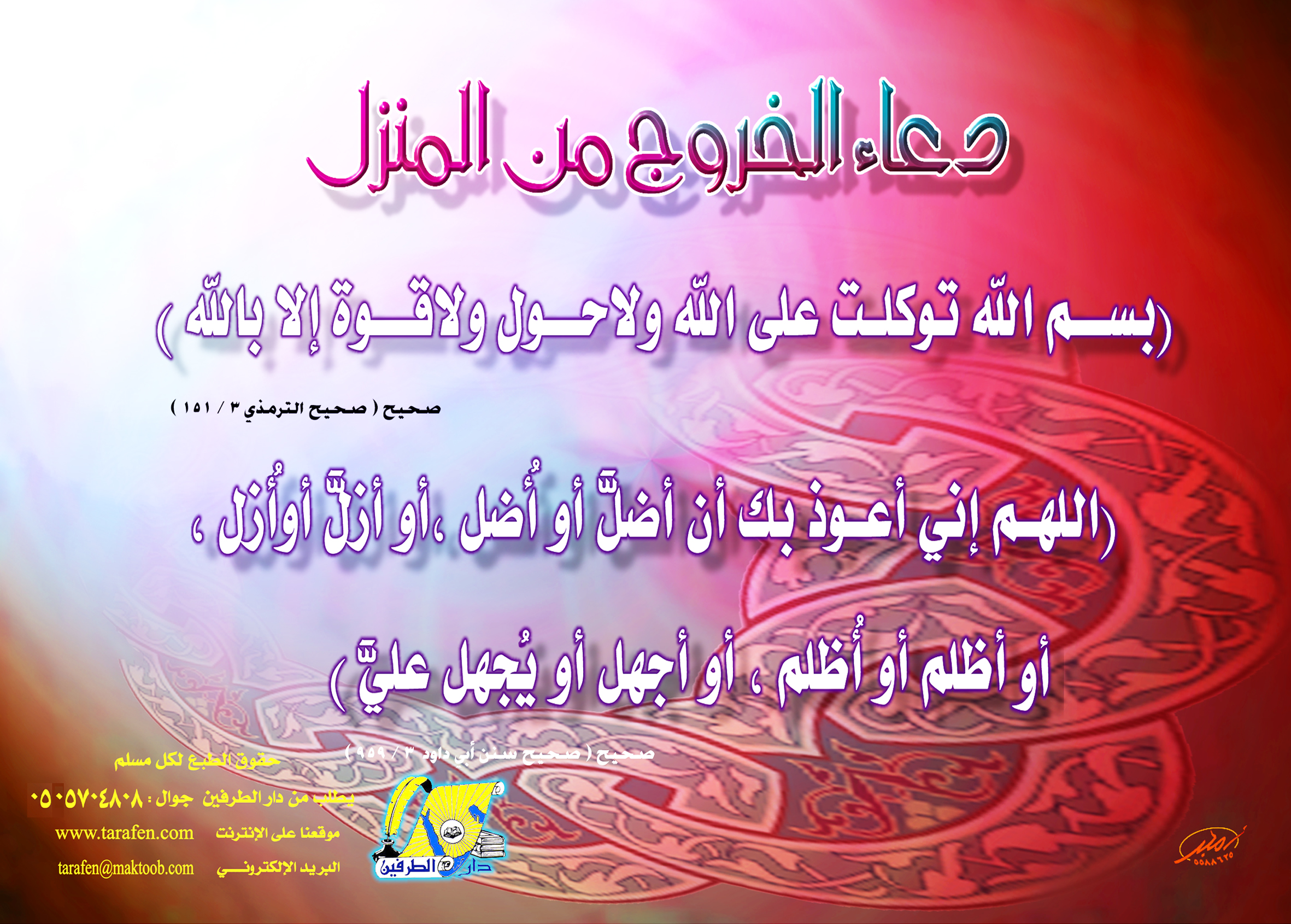 دعاء الخروج من المنزل وفضله الدعاء من العبادات التي يتقرب فيها العبد الى الله عز وجل حيث ان الدعاء يزيل الهموم ويفك الكربات وهو طلب العبد من الله الاشياء كما يفضل اختيار الوقت المناسب التي يستجاب فيها الدعاء وهي ما. كما قال الدكتور مجدى عاشور مستشار مفتى الجمهورية إن دعاء الخروج من المنزل يحتاجه المسلم كل يوم أثناء خروجه منوها بأن النبي الكريم صلى الله عليه وسلم علمنا أن نقول بسم الل ه توك ل ت ع ل ى الل ه الل ه م. باسم الله توكلت على الله اللهم إني أعوذ بك أن أضل أو أضل أو أزل أو أزل أو أظلم أو أظلم. سنن نبوية مهجورة 3 دعاء الخروج من المنزل.
