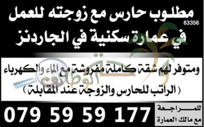 عاجل مطلوب عامل حارس منزلي للعمل الاتصال مع عفوا. مطلوب عامل وبنفس الوقت حارس بمزرعة بناعور الراتب 325 دينار 0775623466 منقول. 94 مطلوب حارس وظائف شاغرة متاحة. شركة نقوم بتأمين حراسات أمنية في انحاء المملكة 2020 09 10.